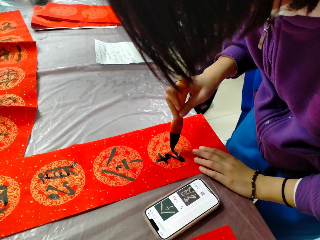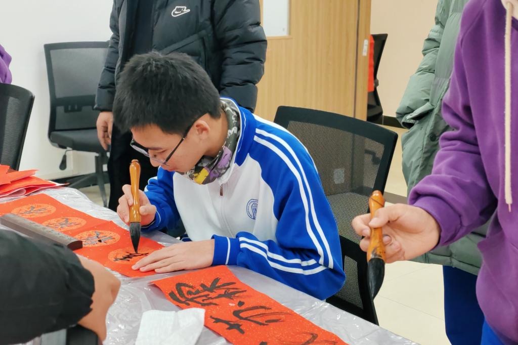 活动的第一个阶段是楹联对句,同学们踊跃参与,根据(上联)给出最佳对句(下联)。由老师评选出最佳对句后,同学们都纷纷积极来到会议室拿着毛笔,一笔一画,认真地书写着。春联纸、毛笔和砚台被整齐的摆放在桌子上,鲜红的纸张渲染着浓浓的节日氛围。同学们各显神通,对联上有楷书、隶书、行书和篆书,体现了同学们对中华优秀传统文化的应用理解。学习不仅仅有课程和作业,也可以像这样的实践活动一样,充满了乐趣和色彩。