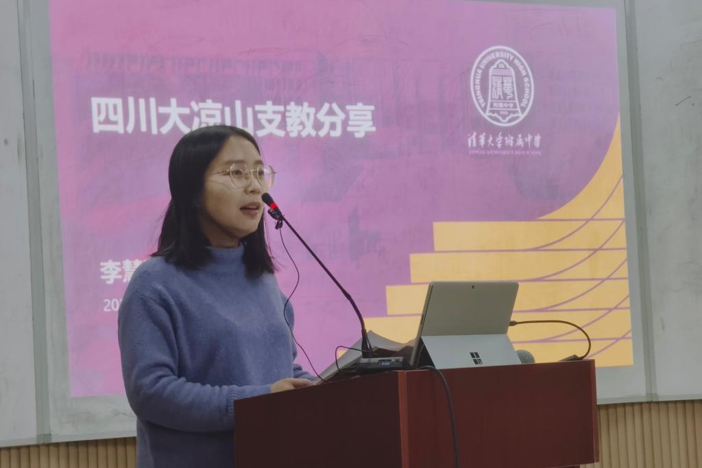 首先是两位走进大凉山支教的青年教师的心得分享。李慧蕾老师从地理的视角分析大凉山的地域特征,并分享四天的支教经历。她深切感受到,短暂的支教或许不能从根本上解决问题,但是这在向边远地区的孩子们传递着温暖的信息——他们正在被看见。刘宁老师梳理了大凉山“一步跨千年”的历史巨变。她总结到,孩子们只有接受教育才能真正改变,只有教育才能真正改变一片土地。