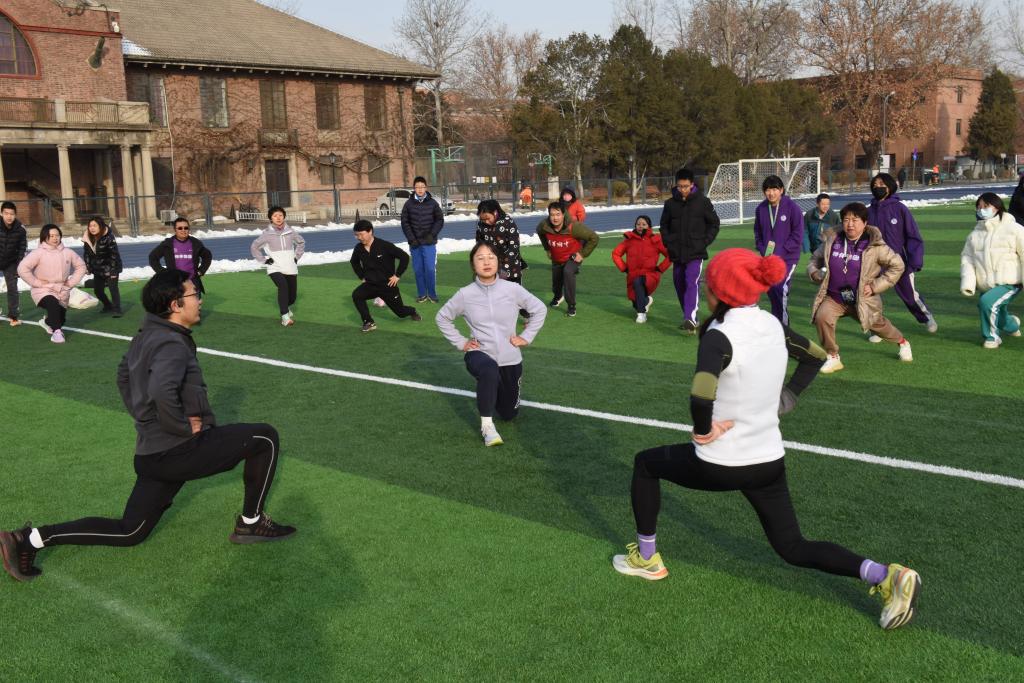 随后开展的热身环节,由高23陈馨颐妈妈和清华大学“Runislove”跑团团长王哲博士、张蓉博士带领全体参跑家庭热身。大家在洒满阳光的西大操绿茵场围成一个大圈,认真完成每一个热身动作。