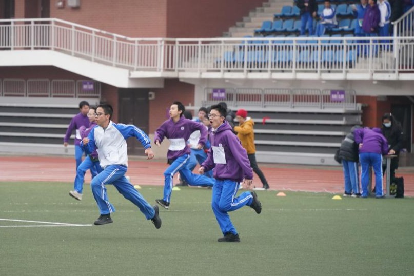 此次比赛将英语与体育进行学科融合,分为词王接力赛和表演赛两个项目。在接力赛中,各班随机派出10名同学代表班级与随机配对的班级对战。同学们先完成50米短跑再进行“天学网”单词PK,并与下一位同学击掌接力。比赛现场气氛紧张而热烈,观众们的欢呼呐喊此起彼伏。经过第一轮淘汰赛,8个晋级班级进行了最终的角逐。每位同学拼尽全力为班级荣誉而战,在跑道上驰骋,在屏幕前争锋。