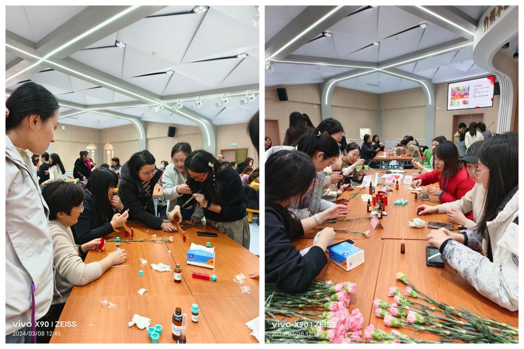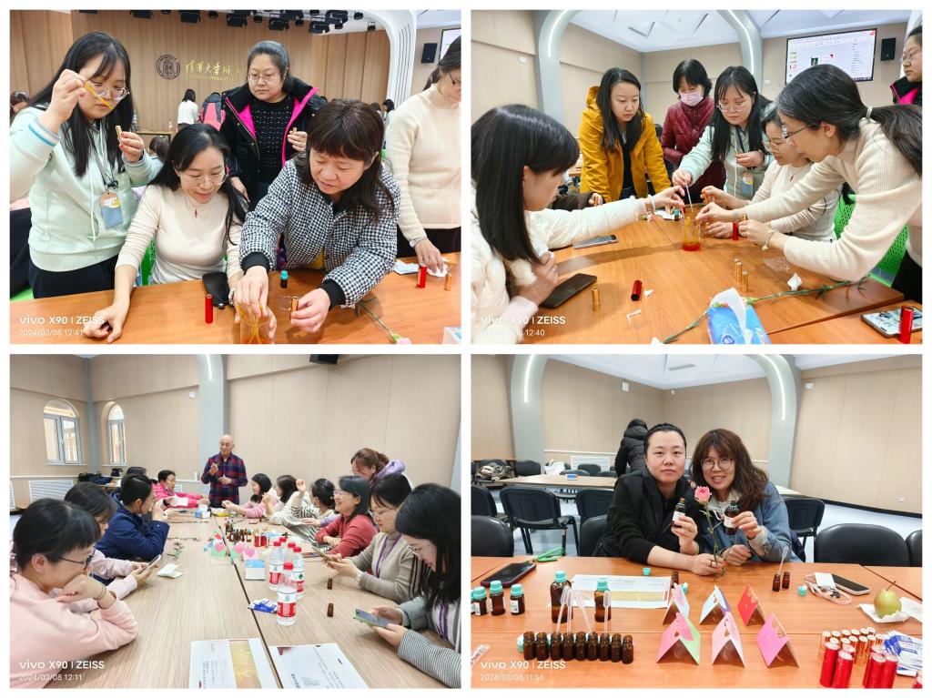 3月8日中午工会在多功能厅举行了“芳菲三月 闻香识女人”的精油制作体验活动,活动分为香印、香识、香知、香愈四个环节。通过活动,希望老师们能够“闻香识自己”,疗愈身心,完善自我。