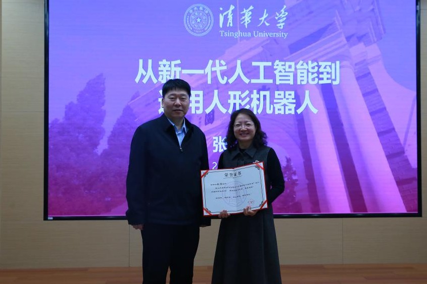 随后,张教授从人工智能拓展至人形机器人,由“机器人会不会代替人”这一问题引入,结合机器人的发展历程,介绍了计算机与机器人融合的现实意义。张教授用生动的例子展示了机器人的魅力,从对自主性和智能性要求高的智能无人系统,到清华大学无人机项目、平衡车项目,展示了机器人领域的研究突破和应用前景。