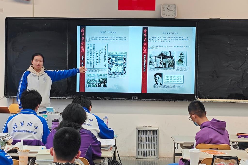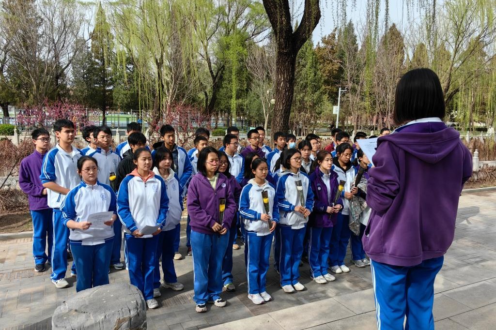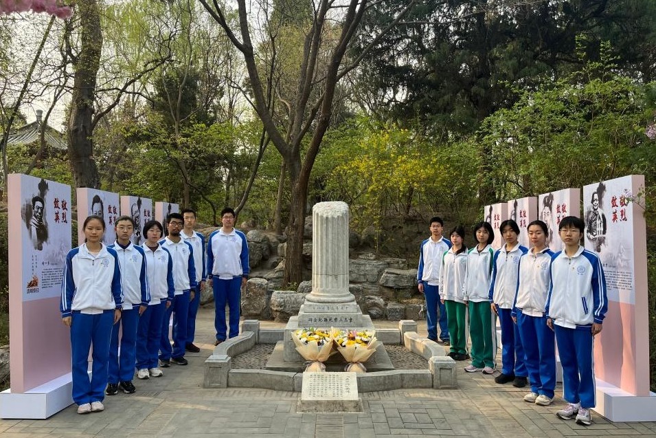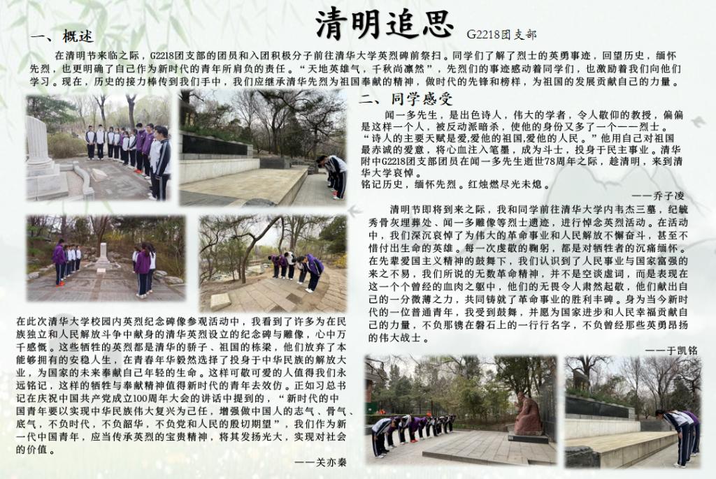 高一11班、15班在清明特色主题班会中组织全体同学一起前往清华大学的英烈纪念碑建筑群进行祭扫。同学们献上鲜花,表达对先烈的敬意。高一5班采用线上学习的活动形式,利用课余时间访问中华烈士网、清华大学红色网站等进行“云祭扫”。同学们通过多种形式,进一步了解学习先烈们的事迹与贡献,增强对历史的了解以及对先烈的敬仰。