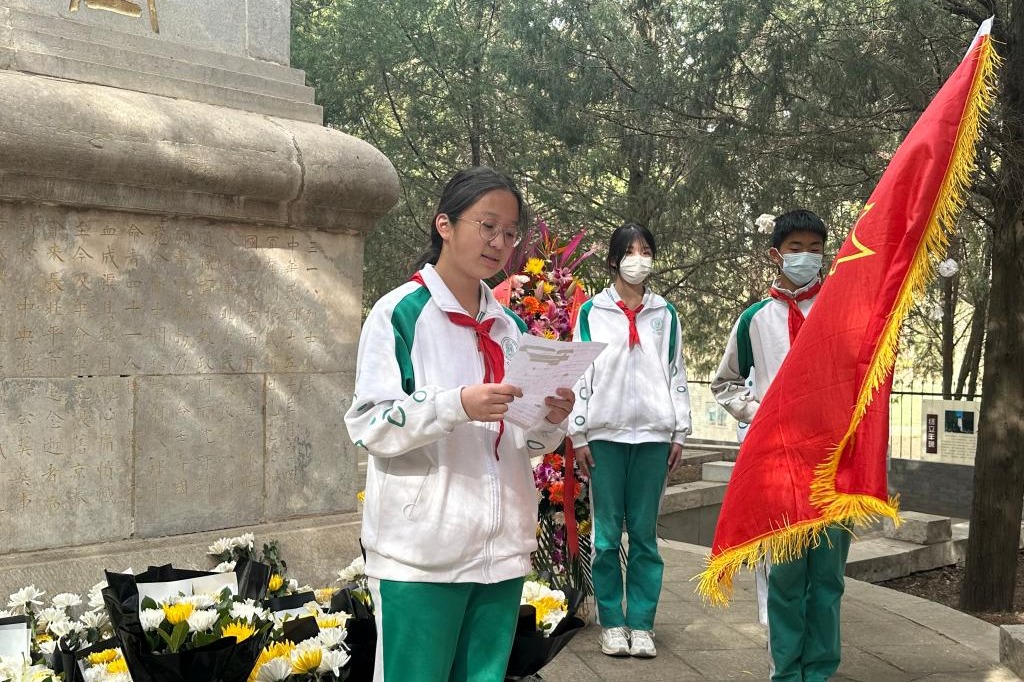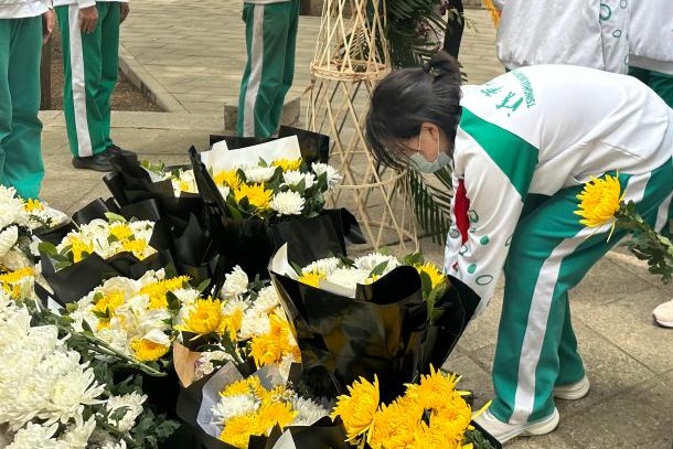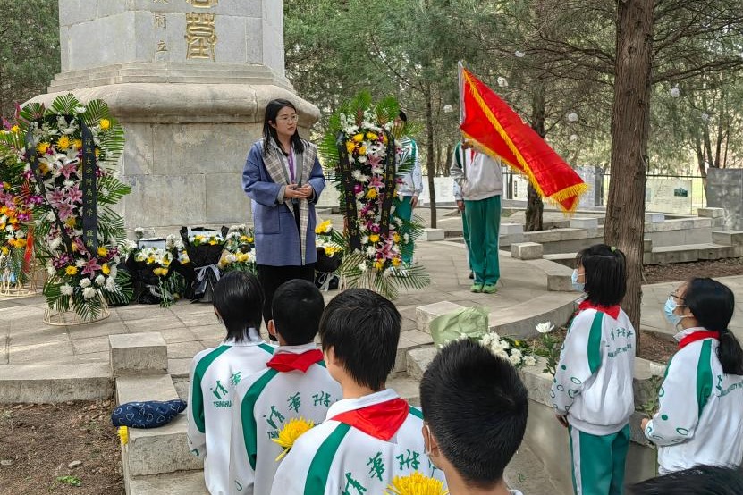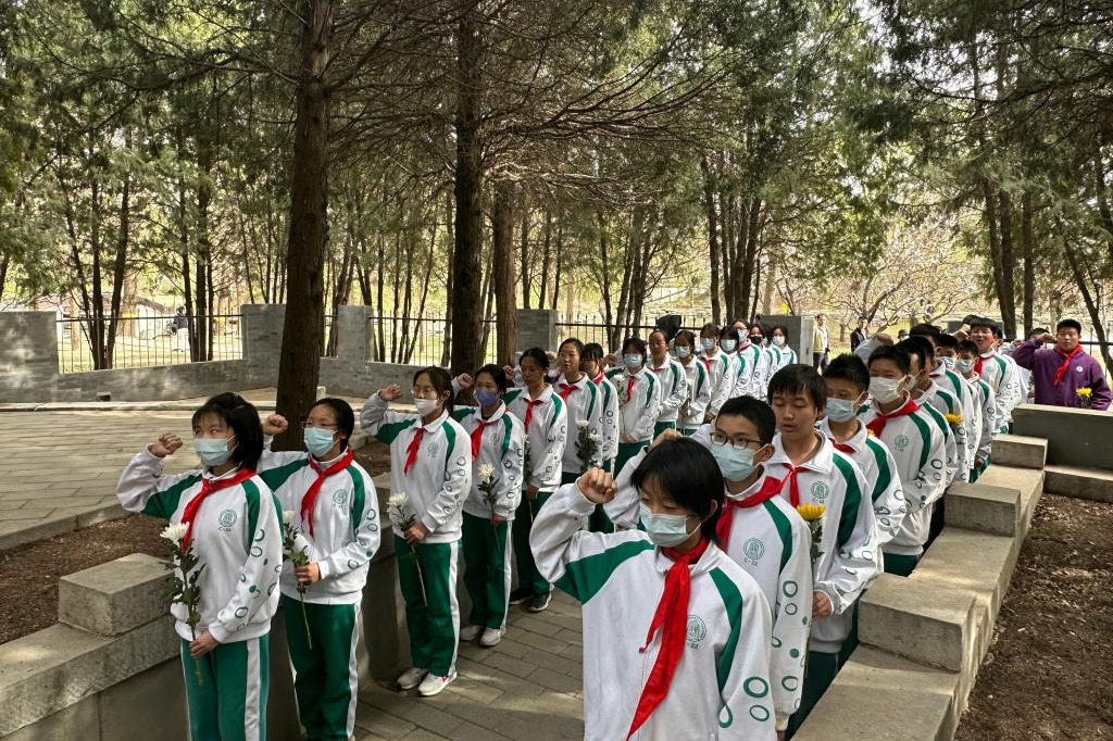 4月4日清明节上午,清华大学“铭记历史,缅怀英烈”烈士祭扫活动在“祖国儿女 清华英烈”纪念碑前举行。皇冠体育官网学生会指导教师娄赛赛带领高一、初二学部学生干部和优秀团员代表共12人参加了此次追思先烈活动。同学们在清华英烈碑前肃穆而立,集体默哀后,依次走到纪念碑前献花,寄托自己的哀思。