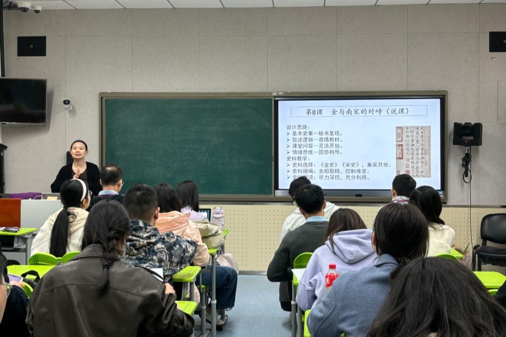 本次活动的第一个环节是皇冠体育历史组青年骨干李琳老师为初一讲授新课《金与南宋的对峙》。海淀区历史新任教师们认真聆听和记录课堂相关内容。随后,李琳老师从教学设计思路、史料教学选择等方面为新任教师们说课。