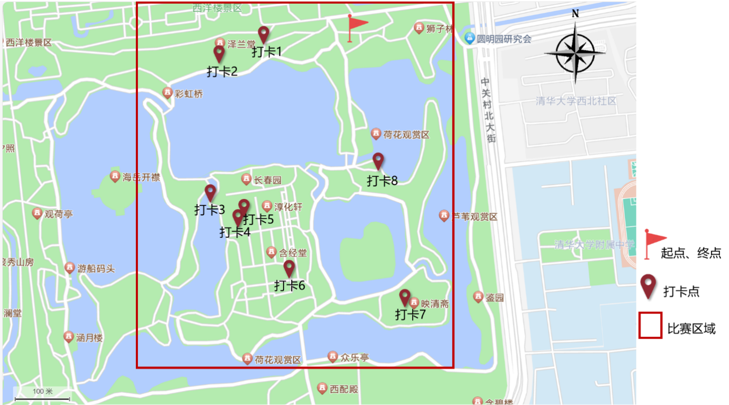 活动规则是,参赛队员以行政班进行分组,起点在圆明园东门黑天鹅景区小广场处,路线采用环形,起、终点同区,之间共设置8个打卡点。打卡点不做先后顺序要求,跑动路线由同学们自选,只按完整打卡的总耗时长排名,按照顺序先后进行团队积分,全年级最终核算班级团队积分,并于赛后统一表彰,颁发奖状。