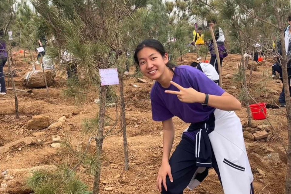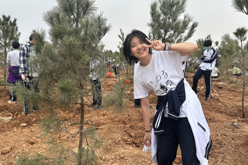 登上高峰,同学们欣赏雾气氤氲的山间美景,也眺望自己刚刚种下的树林、许下的心愿。此时青松正劲,无悔青春;来日星河滚烫,不负韶华。