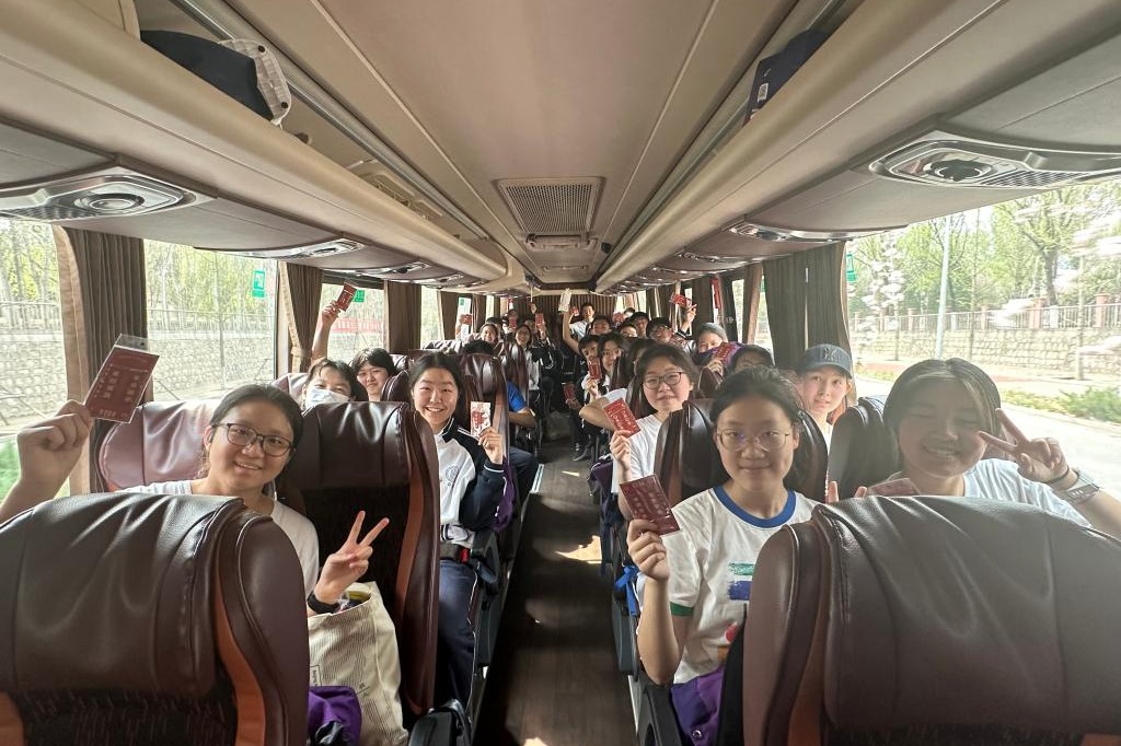 返校途中,同学们手持登顶后的纪念品快乐合影