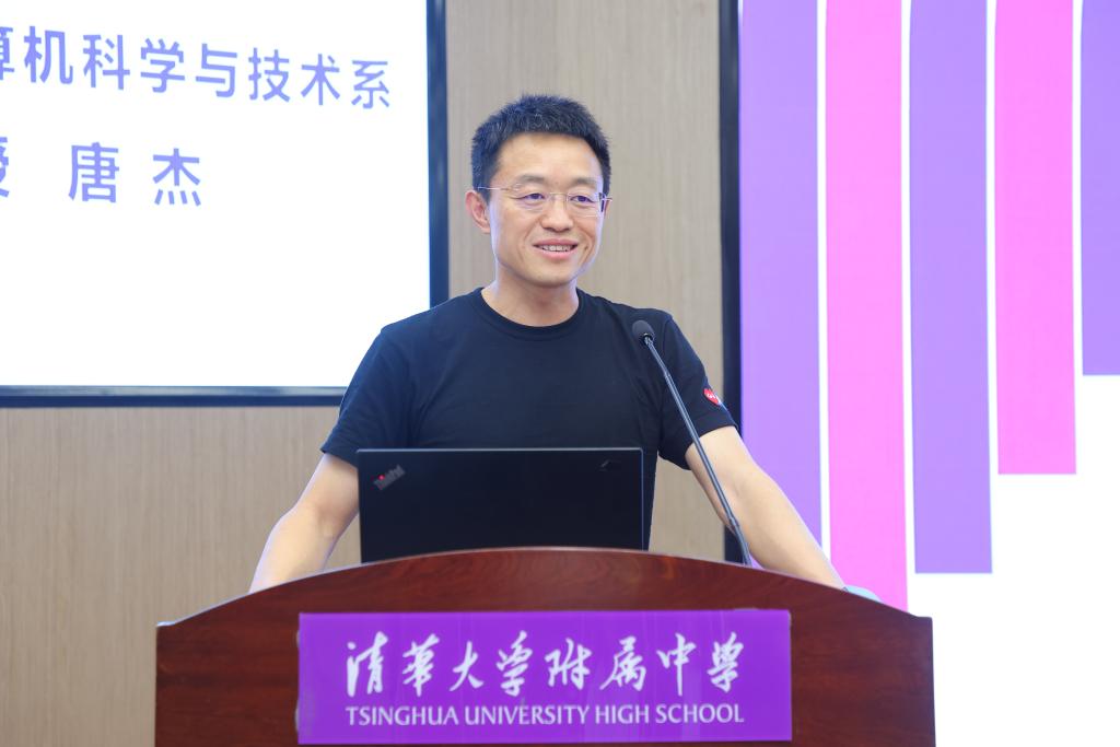 开班式后正式开始本期培训的第一次课程。清华大学人工智能研究院基础模型研究中心主任、清华大学计算机科学与技术系教授唐杰作题为《大模型到AGI的一点思考》的专题报告。大模型是新型AI基础设施的关键底座,大模型的竞争也是国家科技战略的竞争。报告带大家回顾了人工智能的发展历程,解密了大模型的奥秘,深入剖析了人工智能技术的最新发展方向,并与大家分享了中国大模型之路面临的关键挑战,以及人工智能技术在教育领域的应用前景。报告内容丰富、理念超前,赢得了现场阵阵掌声。