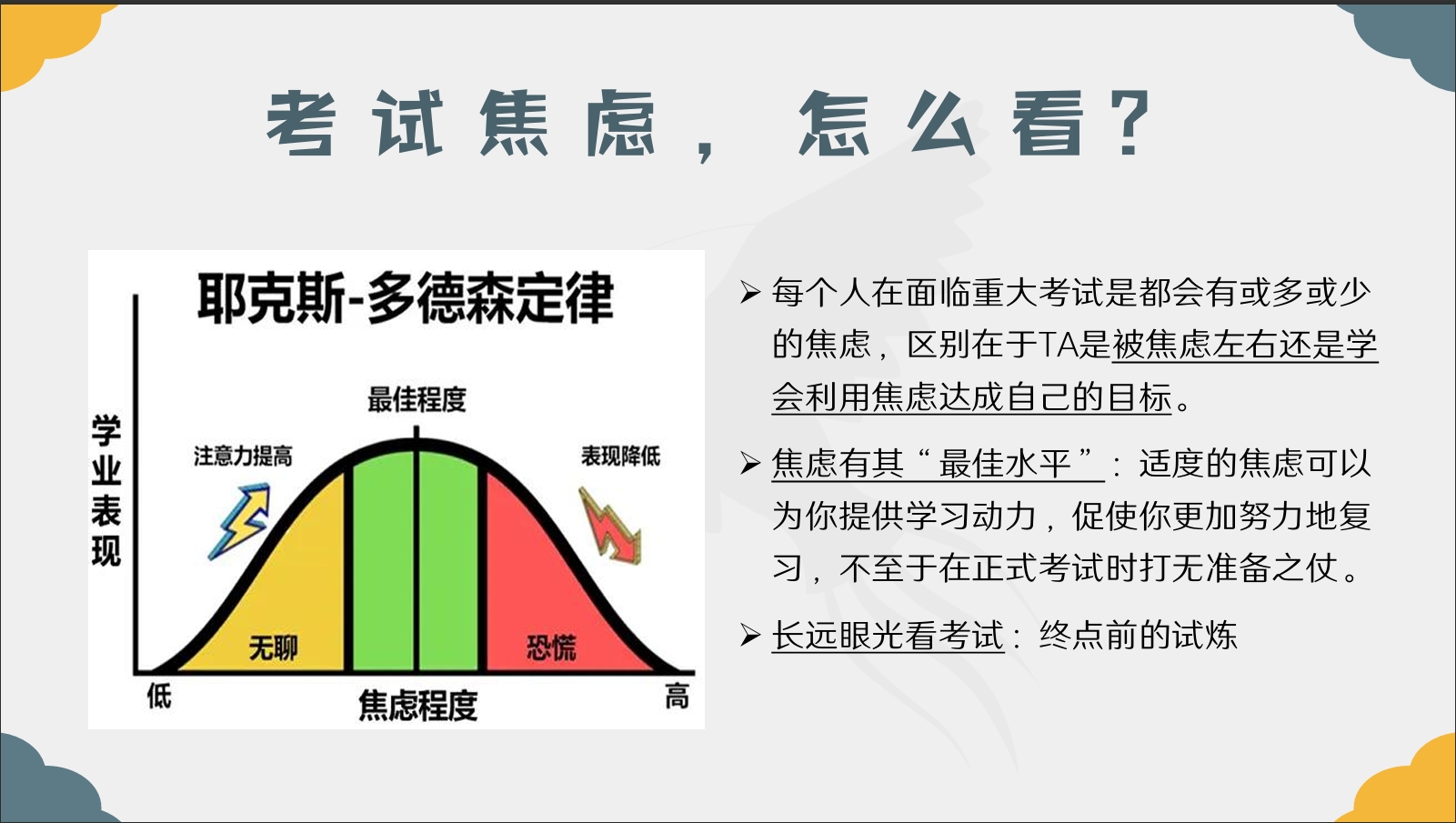 首先,张琬婷老师从“考试焦虑”的两面性出发,为学部全体学生介绍了焦虑的“最佳水平”,适度的焦虑可以提供学习动力,使复习更加高效。