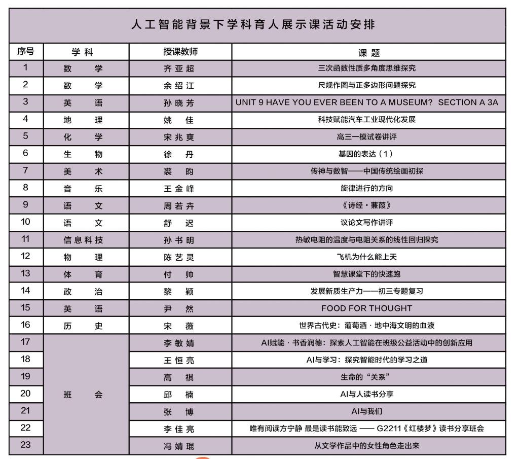 本次展示课别出心裁,通过运用人工智能等科技手段,进行教学设计,实现人工智能与教育、教学的双融合。学校邀请来自13个学科的16位骨干教师开展人工智能与学科教学相结合的展示课,邀请来自4个学部的7位班主任教师开展人工智能与教育相结合的班会展示课。