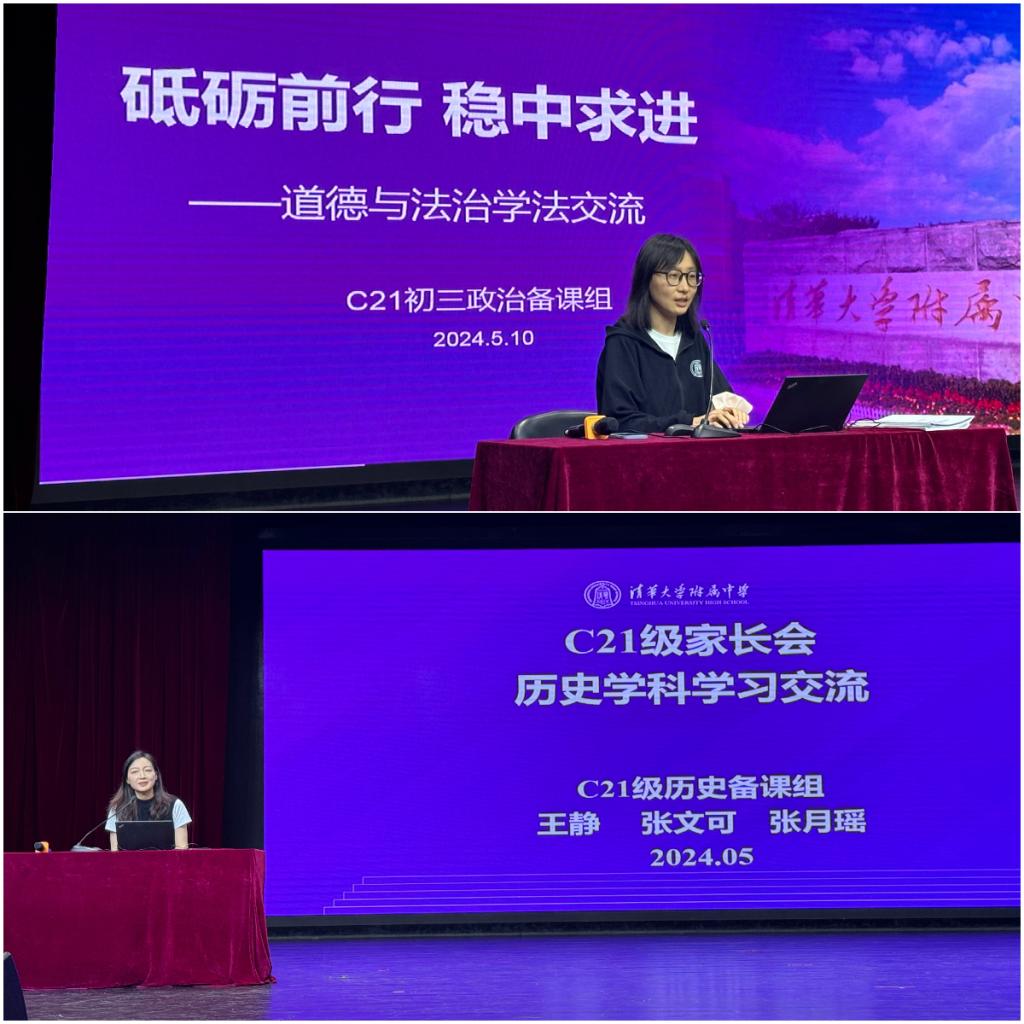 道德与法治学科黎颖老师首先通过具体详实的试题分析向家长强调了学科学习过程中的思维成长;历史学科王静老师细致梳理了学生学习历史学科两年多以来的成长和变化,并强调了未来面临的挑战。