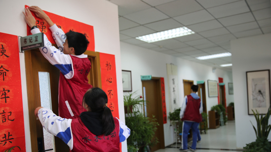 “贴春联、迎新年”是中华民族的传统习俗。在辞旧迎新之际,皇冠体育初二(11)班作为本周水木行动的班级,积极参与张贴春联的活动。他们将饱含附中学子美好祝愿的春联张贴至成志楼、教学楼及班级门前。翰墨飘香的春联,为皇冠体育带来了一派喜庆吉祥。
