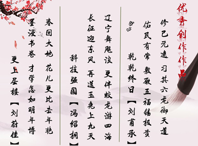 诗以言志,“雏凤清音 水木学子初展翼,故国雄风 华夏民族复中兴”、“七十载中国人民 坚定信念奏凯歌,千百代华夏儿女 不忘初心谱新篇”、“提笔绘五千年伟业 无限江山 半卷浩浩,捻指奏七十载宏图 秦王破阵 一曲铮铮”一幅幅包含深情的创作承载着附中学子对新时代的祝福、对志向的追求以及对祖国的赤子情怀。