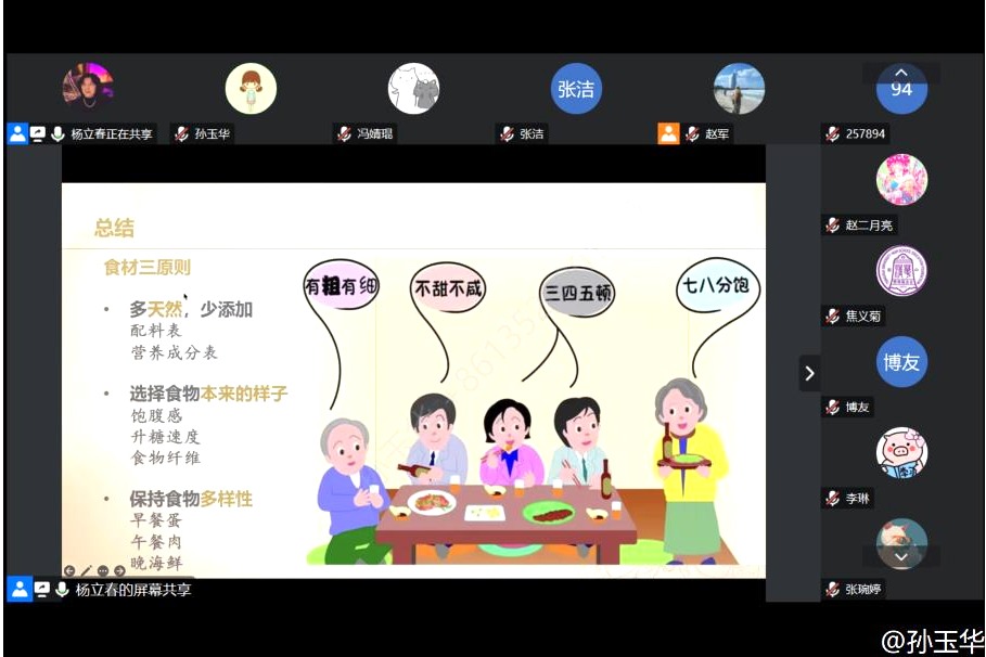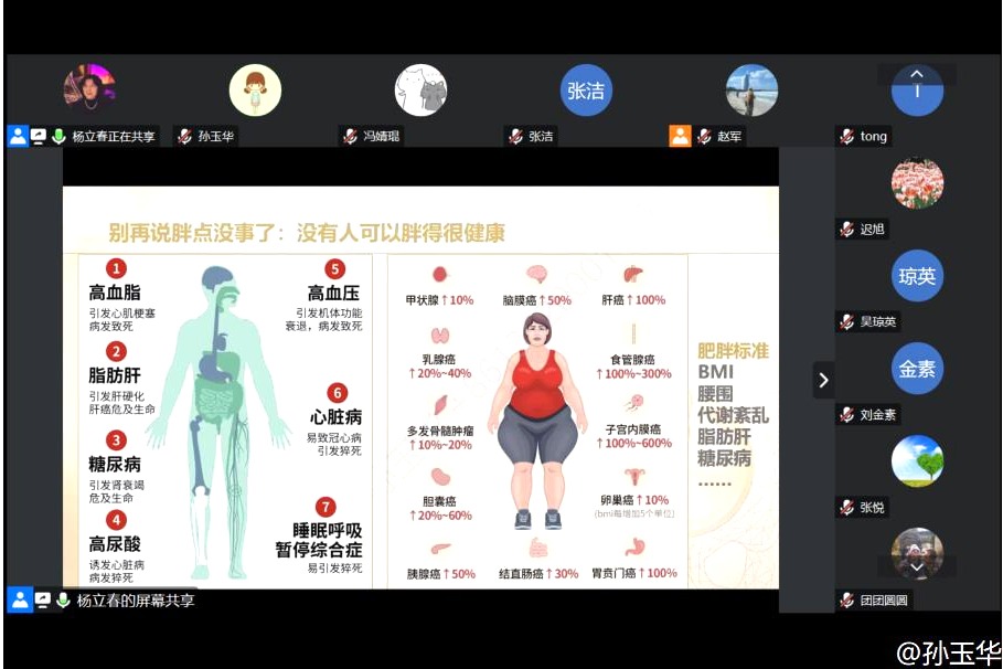 5月17日晚,皇冠体育工会邀请杨立春大夫为本部及将台路校区教职工及家属们做“科学减脂找回久违的轻盈感”的直播讲座。党委副书记兼工会主席张洁老师带领60多位教职工和部分家属线上聆听讲座。