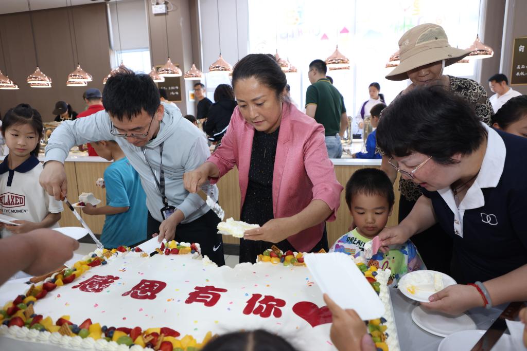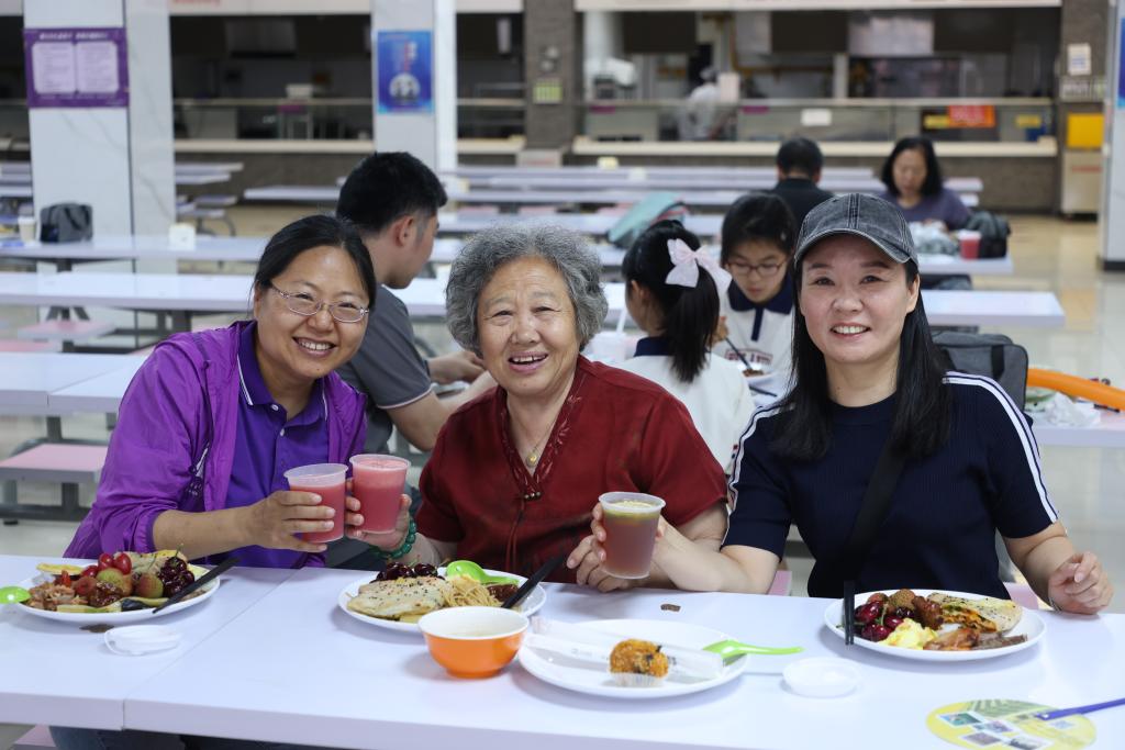 最后,所有教职工家庭欢聚在食堂,凭打卡单领取一份精美奖品并享受美味的午餐。在这里,校领导全员全程陪同,为大家发放礼物共进午餐。