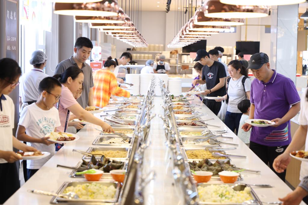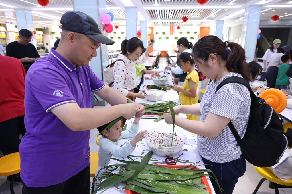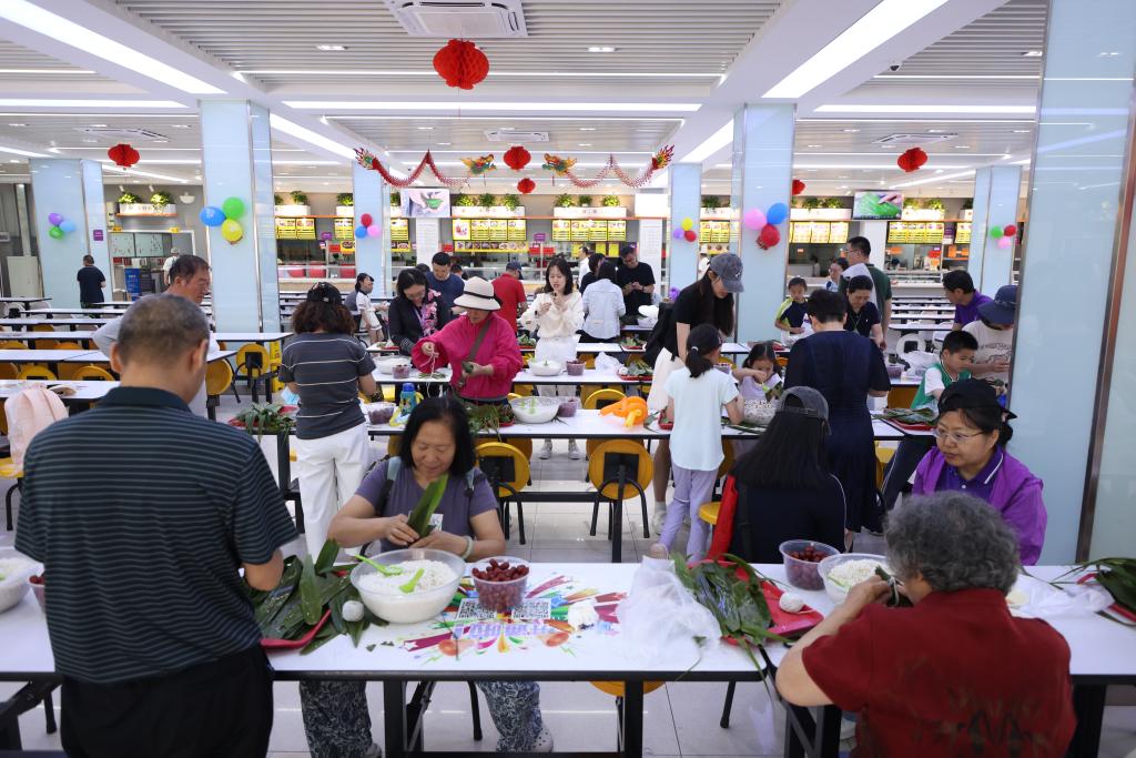 在清晏楼一层,学校食堂特别为大家准备了包粽子的体验活动。在这里,大家可以亲手触摸糯米和粽叶,巧妙地包出一个个可爱的粽子。大家感受传统技艺的魅力,还在欢乐的氛围中培养动手能力。端午节即将到来,老师和家人们在附中食堂一起体验包粽子的乐趣,留下独特而美好的回忆。