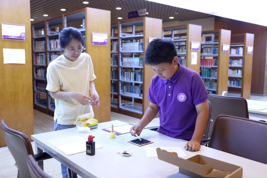 在充满书香的图书馆里安排了两项活动。一是图书寻宝,根据图书馆提供的书目信息(包括书名、索书号),老师和家属在图书馆里找到相应的图书并合影留念;二是活字印刷体验,孩子们在图书馆提供材料的条件下印制一首唐诗。