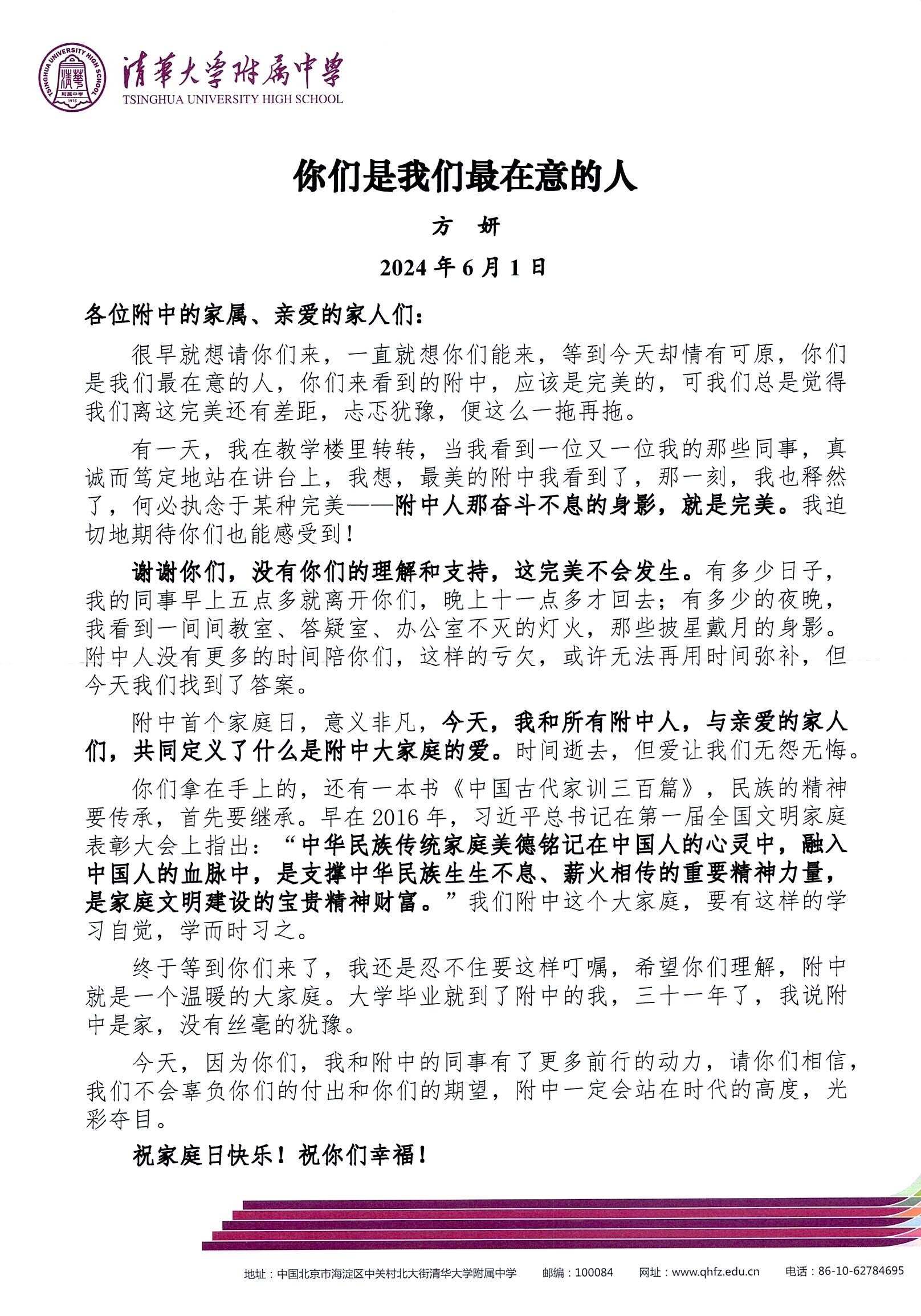 方妍校长撰写的《致家属们的一封信——你们是我们最在意的人》