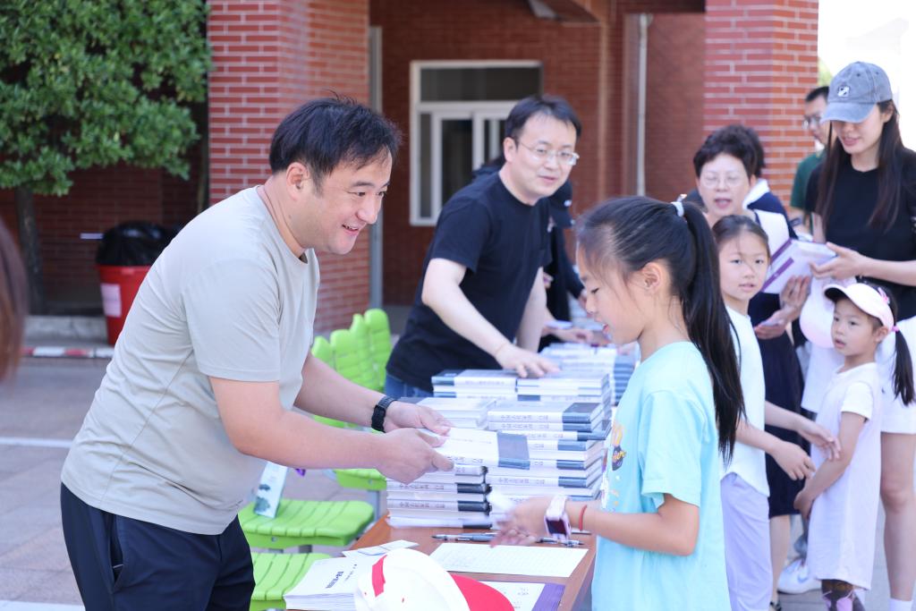 成志楼门口签到处,教职工及家属有序签到,领取校长方妍“致家属的一封信”《你们是我们最在意的人》、方校长赠书《中国古代家训三百篇》、活动打卡单、儿童的六一礼物等。过程中,校领导热情地与家属问候寒暄,赠送礼物,合影留念,犹如一家人,其乐融融。