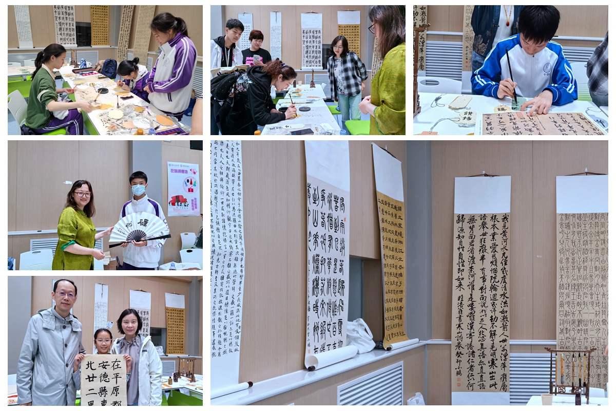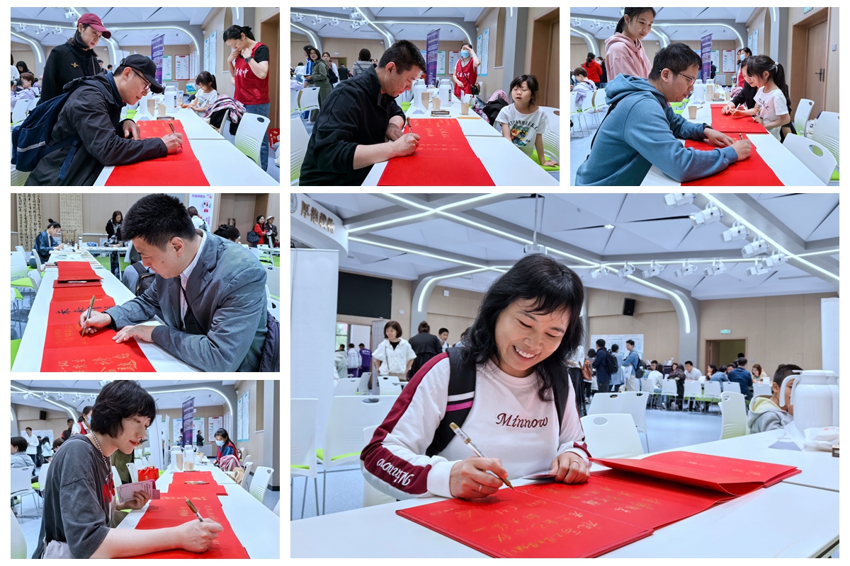 兰亭骨扇集展区墙上,悬挂着水木清芬书画社家长学员的佳作,体现了家长们对终生学习、终身成长的践行。书画社团长在现场示范,为纸扇题字。爱好书法的家长和孩子们也大方挥毫泼墨,感受笔墨间的意趣与魅力。