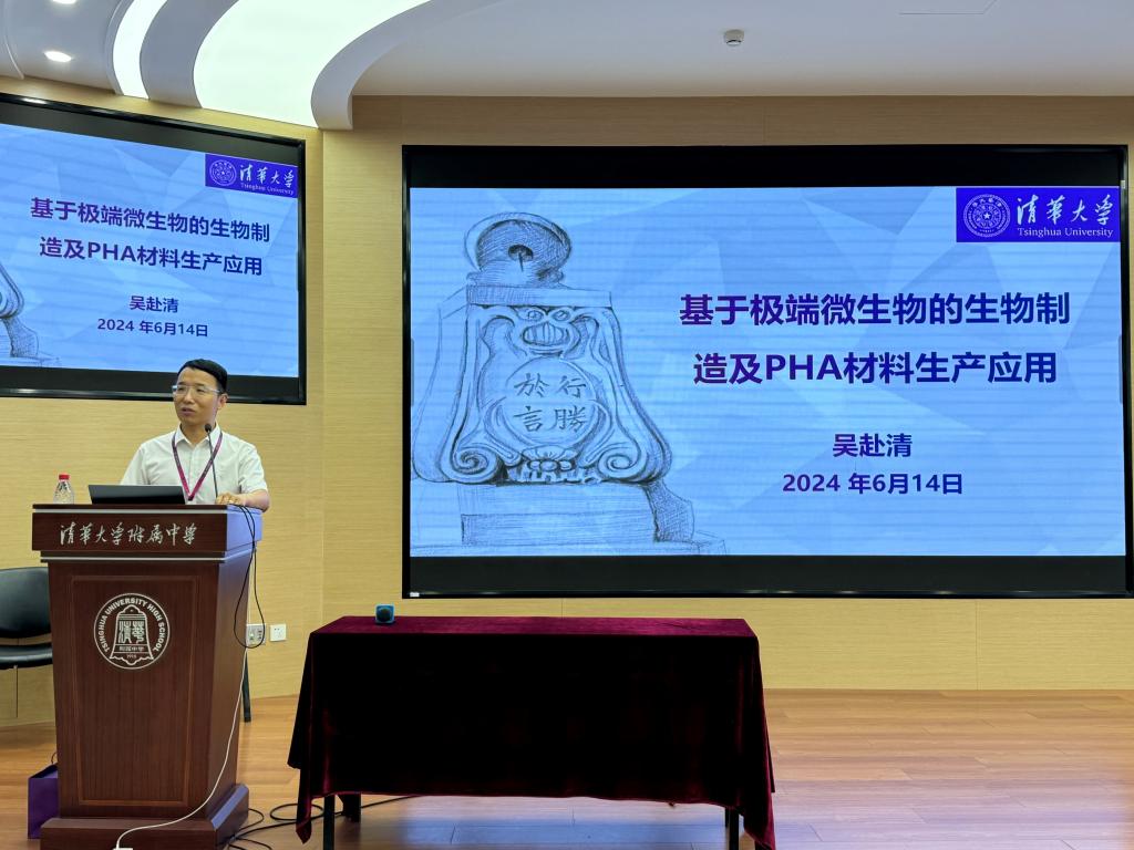 吴赴清教授带来了主题为“基于极端微生物的生物制造及PHA材料应用”的讲座。吴教授详细介绍了极端微生物在生物制造领域的应用,特别是其在生产生物可降解材料PHA(聚羟基烷酸酯)中的潜力。通过生动的实例和详实的数据,吴教授向学生们展示了生物制造的前沿技术以及其对环保和可持续发展的重要意义。他鼓励有志于从事生物科学的学生们,要勇于探索未知,投身于这一充满希望的领域。