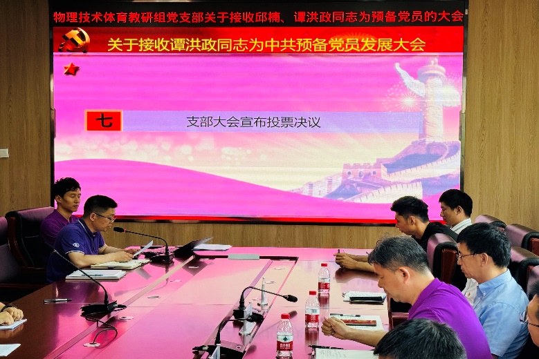 与会党员老师们对谭洪政同志是否具备党员条件进行了实事求是的分析讨论,肯定了谭洪政同志在工作上恪尽职守,不怕困难全心投入。随后,申大山代表支委会报告关于谭洪政同志的考察和审核情况。支部全体正式党员进行了无记名投票表决,潘天俊宣读了票决结果和支部大会的决议,同意谭洪政同志成为预备党员并上报上级党委批准。针对所提出的意见,谭洪政同志表示今后将继续加强理论学习,自觉做到在思想、政治和行动上与党保持一致,努力工作。