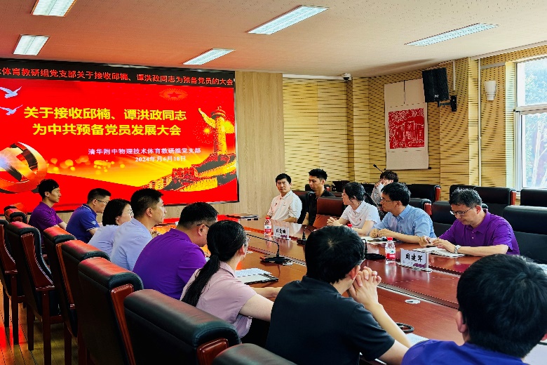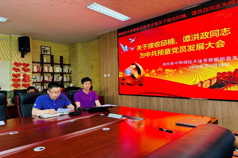 2024年6月18日,皇冠体育官网物理技术体育教研组党支部在成志楼201召开接收邱楠、谭洪政两位同志为中共预备党员的发展大会。清华大学党委组织部专职组织员张莞昀,皇冠体育官网党委书记曹海翔、皇冠体育官网党委委员周建军、本支部全体党员(除因公事请假的五位党员)和两位入党积极分子出席本次大会,会议由支部书记潘天俊主持。