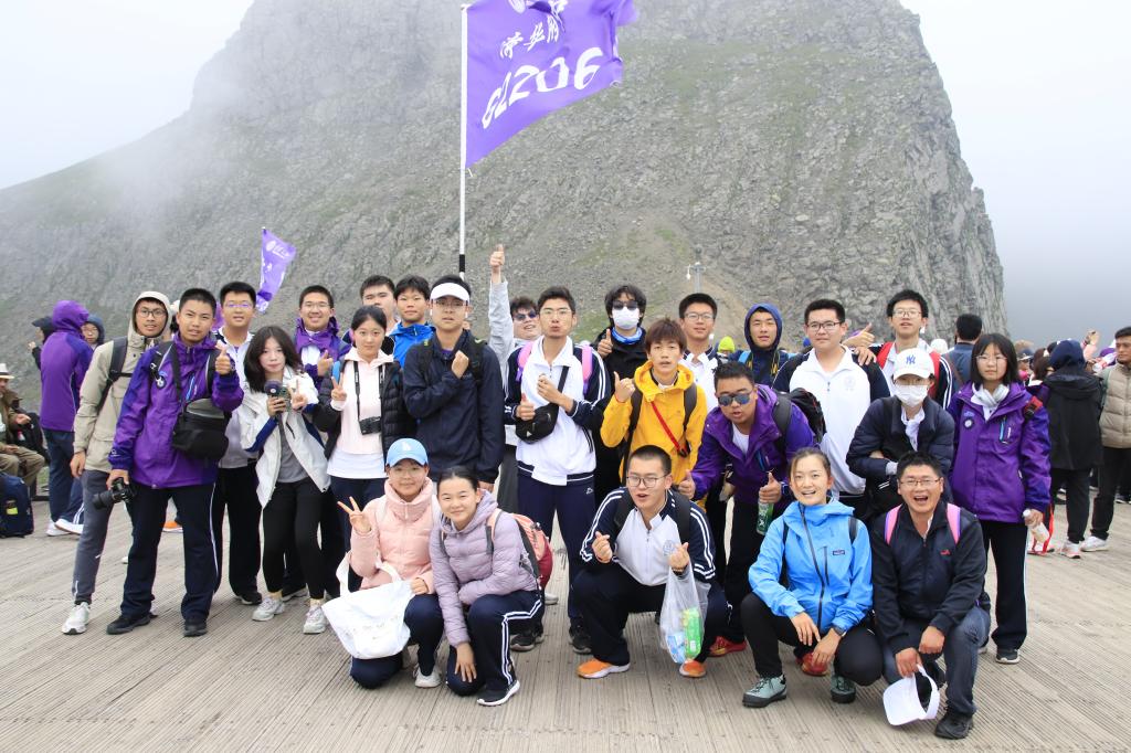 “云空悬镜若天坑,山抱瑶池映绿橙。客仰冰川峰漫雪,舟游半月水含晶。”行程第四天,同学们经过早上登山启动仪式的授旗活动,带着属于自己班级的旗帜,勇攀1400余级台阶登上长白山巅。