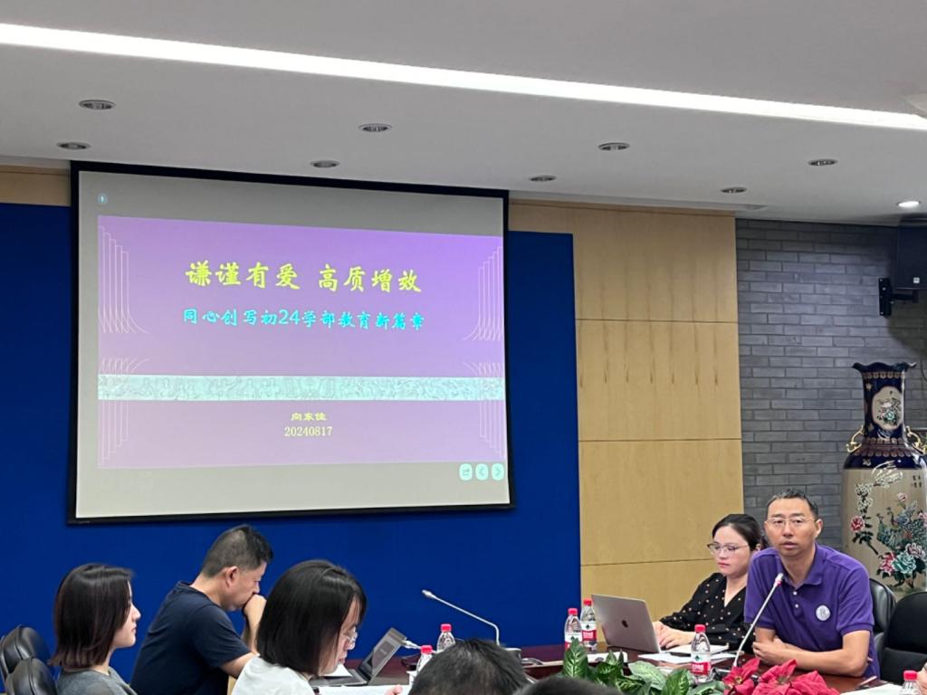 初24学部主任向东佳立足教育高质量发展,从建设高质量班主任队伍、实现高质量班级文化供给、建设高质量治班体系、促进学生高质量全面发展四个层面传达了对年级发展与高质量班主任队伍建设的愿景,并结合附中的校园文化和阶梯式育人目标,明确了初24学部的总体规划和初一学段的育人目标,指导班主任在班级建设中重视文化的涵养、积极发掘班级特色,既要脚踏实地,也要敢于创新,同心谱写初24学部教育的新篇章。