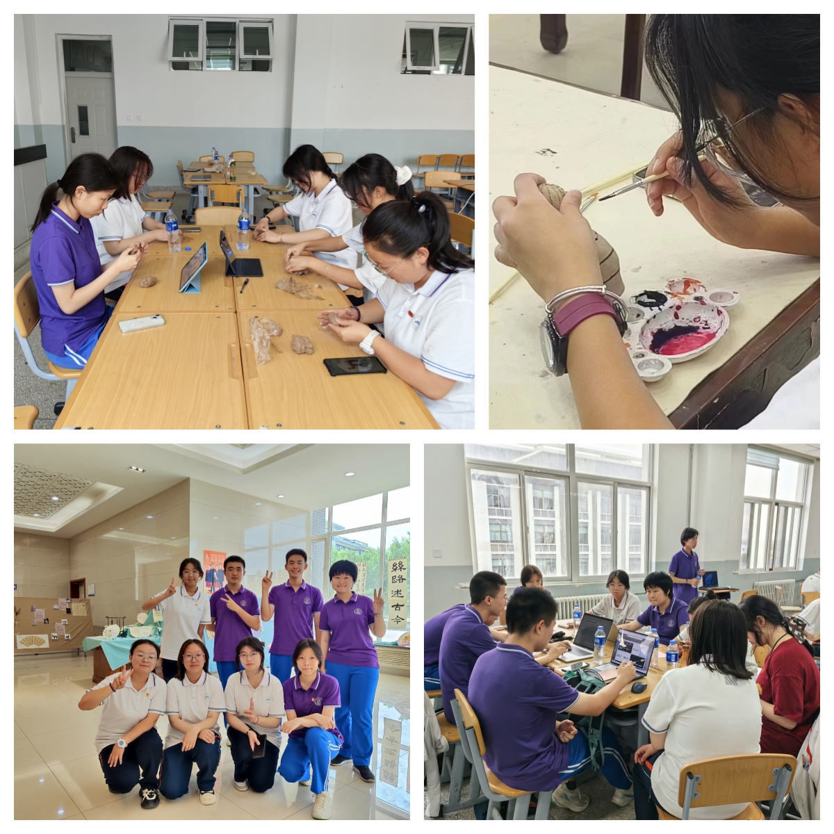 文博组带给我们的是一场丝路历史文化小型展览。同学们查阅了许多史料和文献,反复商讨策展框架,最终确定了“源”“流”“汇”三个板块。从货币、生产、艺术等角度,通过文物与论文结合的研究方式,图片与文字结合的展示方式,呈现出汉唐时期丝路文化交流发展的总体脉络。在布展中,同学们挥毫泼墨书前言介绍,并用陶土塑造重点文物。希望通过这一小组成果,观众们能体悟丝路文化的灿烂。