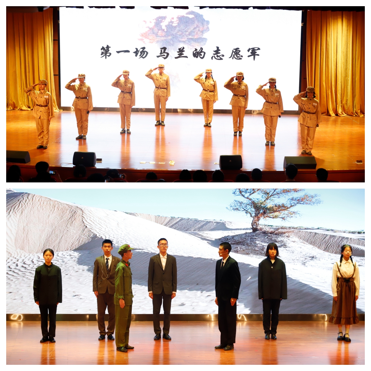 戏剧组的12位台上演员、3位幕后同学和3位幕后老师,在酒钢三中的音乐厅,献上了中学生版诗画剧《我愿以身许国》的首场演出。21.5个小时的九次完整排练,“八百标兵奔北坡”的专业练声,边排练边改剧本改幕景……没有一个演员“掉链子”,这些辛苦与快乐一定会成为两校同学们一生难忘的记忆。正如指导教师向东佳老师所说:“演员与演员之间、幕后工作者与演员之间的磨合,是一个心灵与另一个心灵之间的碰撞”。