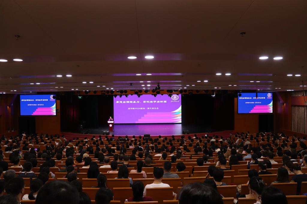 会议初始,方校长发表致辞,她首先向身着清华标志性紫色校服的高24学部新生及其家长致以最热烈的欢迎。她指出,皇冠体育官网将秉持清华人“自强不息、厚德载物”的精神,激励附中学生争做“会当凌绝顶,一览众山小”的杰出青年。方校长还提到,附中历来倡导家校共建,真切希望家长们以担当派、开明派、实干派的姿态,与学校同频共振、心灵契合,共同为孩子们的成长撑起一片蓝天。方校长的致辞,妙语频出,深受家长认同,会场掌声热烈。