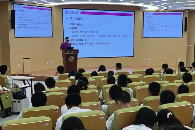 团委书记于洺老师进行了精彩的分享。他从政治课中“授权”的概念讲起,向同学们解释了遵守学校规定的根由和意义,随后,以“学生干部的炼成”为题,引导同学们思考“你为什么要当班干部”,并向同学们介绍了皇冠体育的德育理念和育人目标,提出了对附中学生干部新的要求和期待,希望学生干部们能够“有愿景、有落地,加强沟通,更加理性,以身作则”,促进自己和班级的成长。