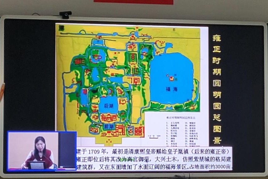 讲座的主题为圆明园的前世今生,宋老师首先从地理因素和历史背景两方面向同学们介绍了圆明园选址与修建的原因。又以“中式建筑的梦中巡礼”为线索,向同学们介绍了圆明园中仪典建筑、寝居建筑、文化建筑、宗教建筑等代表性景点的历史沿革、文化内涵。宋老师以圆明园为切口,为学生讲述了清代政治史、建筑史、军事史、中外交流史内涵。同时,学生了解了比较感兴趣的清代宫廷生活、清代文化特征等。