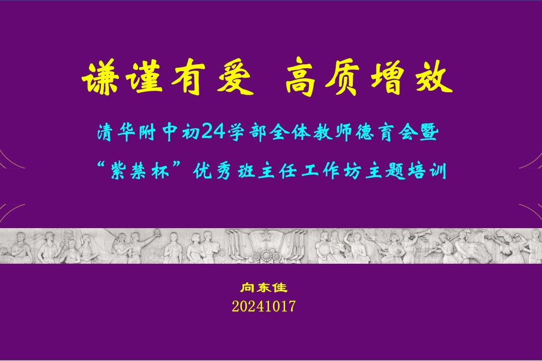 会议的第二部分,由初24学部主任向东佳主讲。首先,向老师介绍了学生发展中心关于家校沟通、各类比赛和活动组织等的建议,也传达了教学管理与研究中心关于学生习惯养成、日常教学规范等方面的建议。向老师还细致介绍了学部在学校育人目标的指导下,明确初中三年的阶梯式培养目标。
