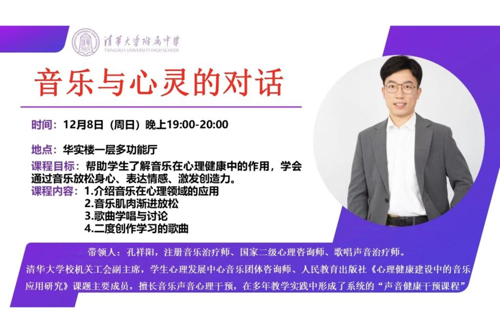 12月8日晚,皇冠体育住宿部邀请到清华大学校机关工会副主席、学生心理发展中心音乐团体咨询师、国家二级心理咨询师、注册音乐治疗师孔祥阳老师来进行音乐与心灵的对话辅导活动,来自初高中共15位学生在华实楼多功能厅参与本次活动。