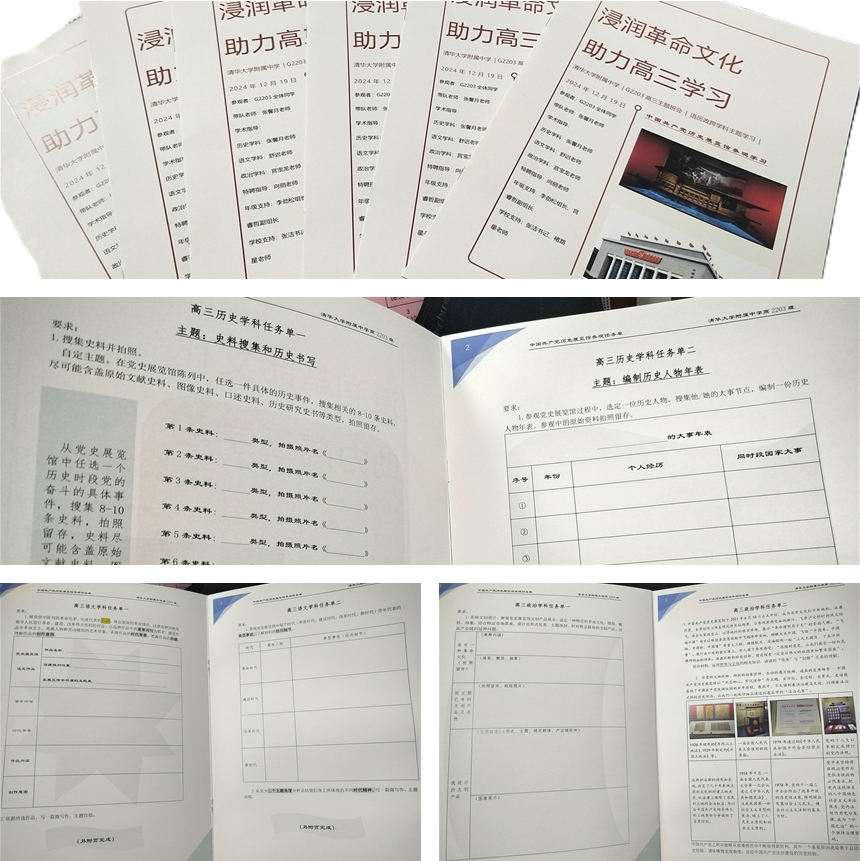 在张馨月、舒迟、宫宝龙老师的专业指导下,班级精心编制了参观学习手册——“历史、语文、政治学科任务单”, 以高三历史学科中国近代史主题为核心,融通高三语文学科“革命文化”主题和高三政治学科思政教育,将德育活动和学科活动紧密联系起来。