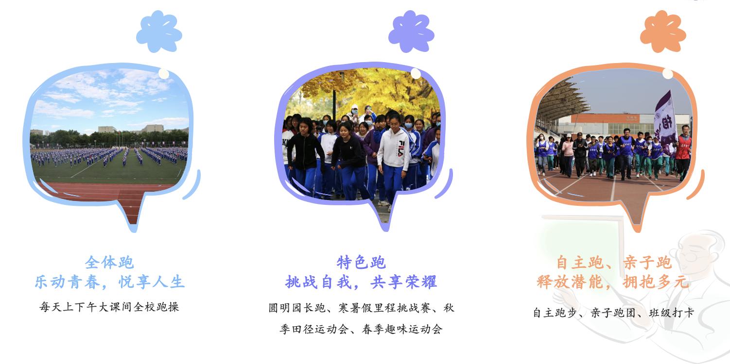 “悦动青春,健康同行”特色跑步活动,由常规跑、特色跑和个性跑组成。常规跑旨在乐动青春,悦享健康。鼓励学生在上、下午跑操时段,伴随着欢快的节奏,迈出整齐的步伐,以更为饱满的状态迎接每一天的学习生活。特色跑旨在挑战自我,共享荣耀。具体可由学部组织,如圆明园爱国主义教育长跑,号召学生将青春的脚步与历史的痕迹相交织,用坚持和毅力诠释青春的无限可能。还有体育备课组指导,如利用寒暑假期,鼓励每位同学在家中或户外开展跑步活动,记录自己的足迹,挑战自我极限,感受成长喜悦。个性跑重在释放潜能,拥抱多元,包括班级的自主锻炼与家庭参与的亲子跑团。
