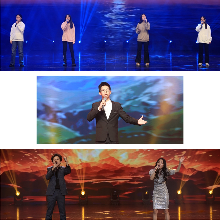 歌曲联唱《你的太阳》(初23学部张子衿、王炫然、王妙桐、王若初)、男生独唱《多情的土地》(高24学部熊浩然)、陈昱嘉、张佳婧老师 重唱《孤勇者》