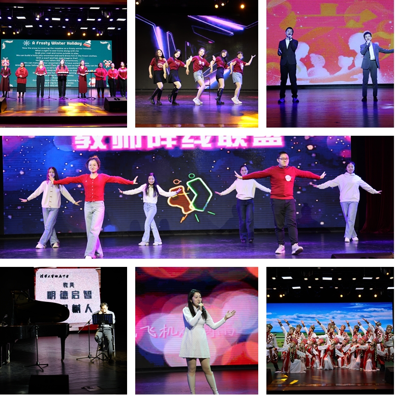 国际部教师合唱《新年合唱》,工间操协会舞蹈《新年艺起嗨》,陈昱嘉、闫志存老师歌唱《把故事写成我们》,教工团舞蹈《教师阵线联盟》,向东佳、王金锋老师演奏《成都》《一生所爱》,刘舒畅歌唱《那些你很冒险的梦》,舞蹈《鄂尔多斯》