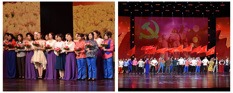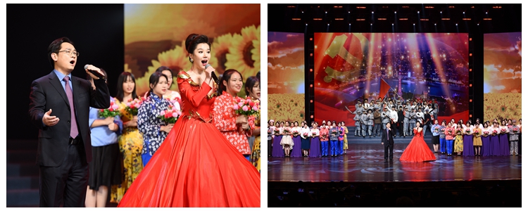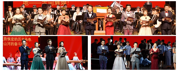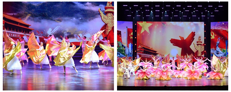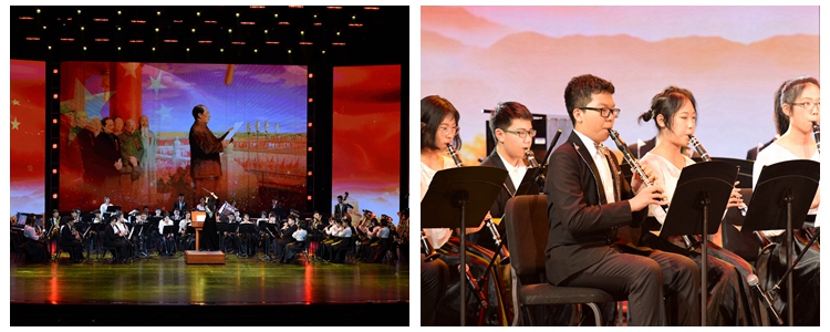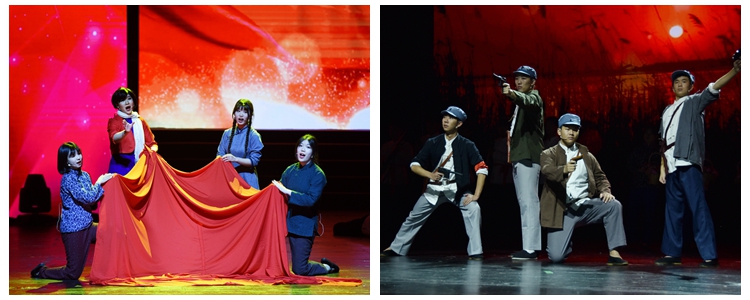 在大型管乐合奏《红旗颂》气势恢宏的旋律中,文艺汇演拉开序幕。演出以中国共产党从抗战时期至今的奋斗历程为主线,分为“硝烟篇:峥嵘岁月、奋斗篇:中国新生、开放篇:伟大转折、辉煌篇:中国梦”四个篇章,通过歌舞、朗诵、器乐、情景表演等舞台手段,再现一代又一代中华儿女为民族独立、国家富强不懈奋斗的伟大历程。整场演出以朗诵串联,师生组合董薇、于平、王潇、林一峥、王勃、陈艳、翟东方、陈柯彤、冯硕、马小艺、刘蕾、吴天昊共同进行主题朗诵。