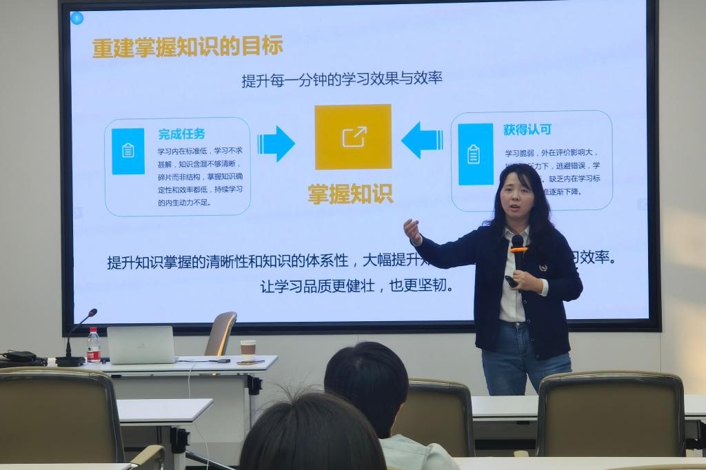 王老师首先从问题入手,“面对自家的娃,有什么时刻,让我们觉得很无奈?”老师们思考其中,并很快进入听讲状态。随后,王老师围绕如何培养自主学习能力这一主问题展开讲解。结合着丰富的案例,先后介绍了自主学习成长模型、重建掌握知识的目标、支持和促进自主时间管理、支持和促进自主化、提振信心、情感满足等几个方面的内容,老师们积极倾听。