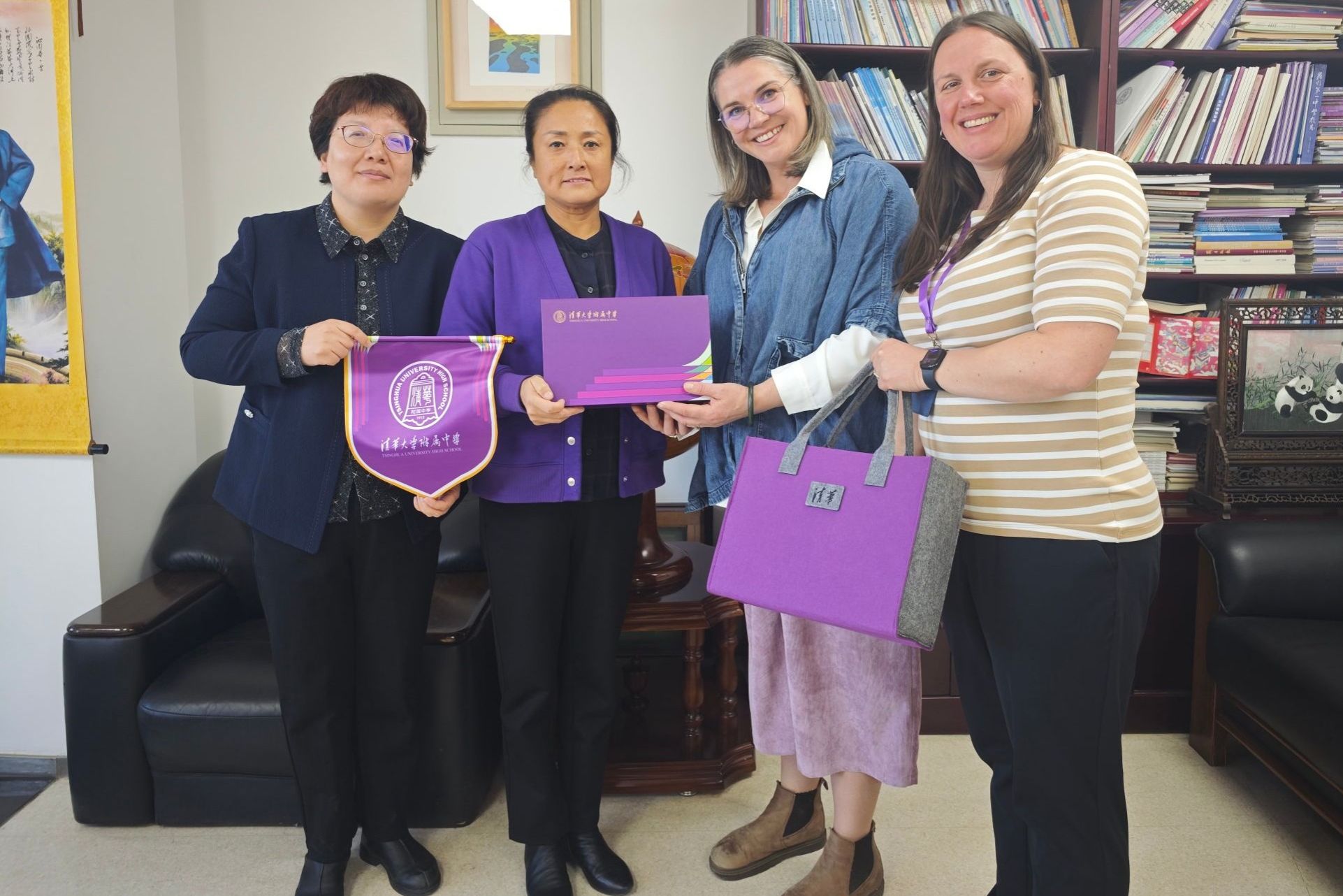 加拿大玛格丽特女王学校带队教师罗伊娜·琼斯(右二)及伊丽莎白·鲁伊特(右一)与皇冠体育校长方妍(左二)、党委副书记张洁(左一)互赠礼物