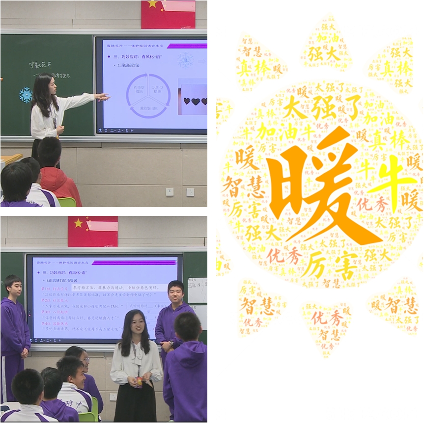 “良言一句三冬暖,恶语伤人六月寒”,初23学部王子嫣老师在学部开展《雪融花开——保护校园语言生态》主题班会,将文明礼仪的内涵推向更深层的思考。通过“冻语词云”与情景剧演绎,学生们直面语言暴力的冰山:一句阴阳怪气的“卷王”,一个哄笑的外号,都可能成为刺破心灵平静的冰锥。通过课前采访与小组讨论,同学们认识到语言暴力对承受者、发出者具有双重危害,需要重视和警醒。大家也认识到,面对语言暴力,除了“以暴制暴”之外,还有更多应对之法。在“春风化‘语’”环节,王子嫣老师用文言智慧与现代沟通法碰撞出火花。在模拟“打击学习”场景时,初2315班同学以非暴力沟通法理性应答,赢得掌声;初2317班用雅言法化解“社交孤立”,写下“集体需要共同进步的空间”的真诚诉求。这场关于语言的觉醒,让“暖言热力值”成为班级生态的新指标。