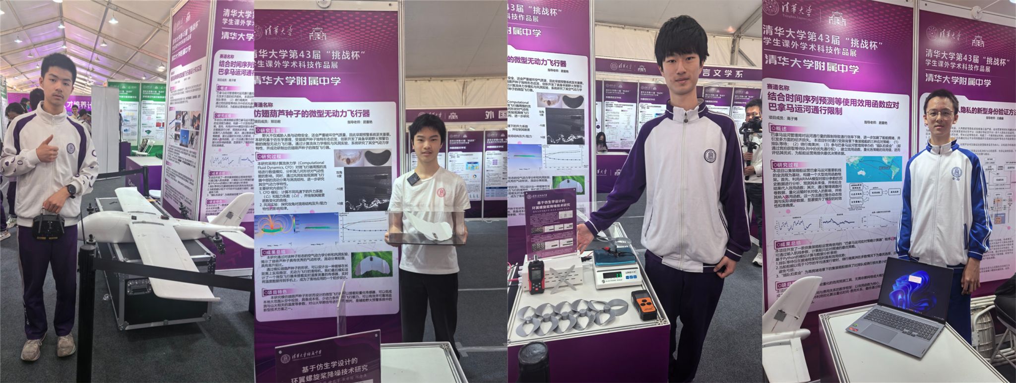 皇冠体育官网的参展作品分为实物互动作品和海报作品两部分。实物互动作品包括“垂直起降倾转四旋翼固定翼飞机”“基于仿生学设计的静音浆”“仿翅葫芦种子的微型无动力飞行器”“自主视力检测”“巴拿马运河通行限制应对策略”共五个项目。