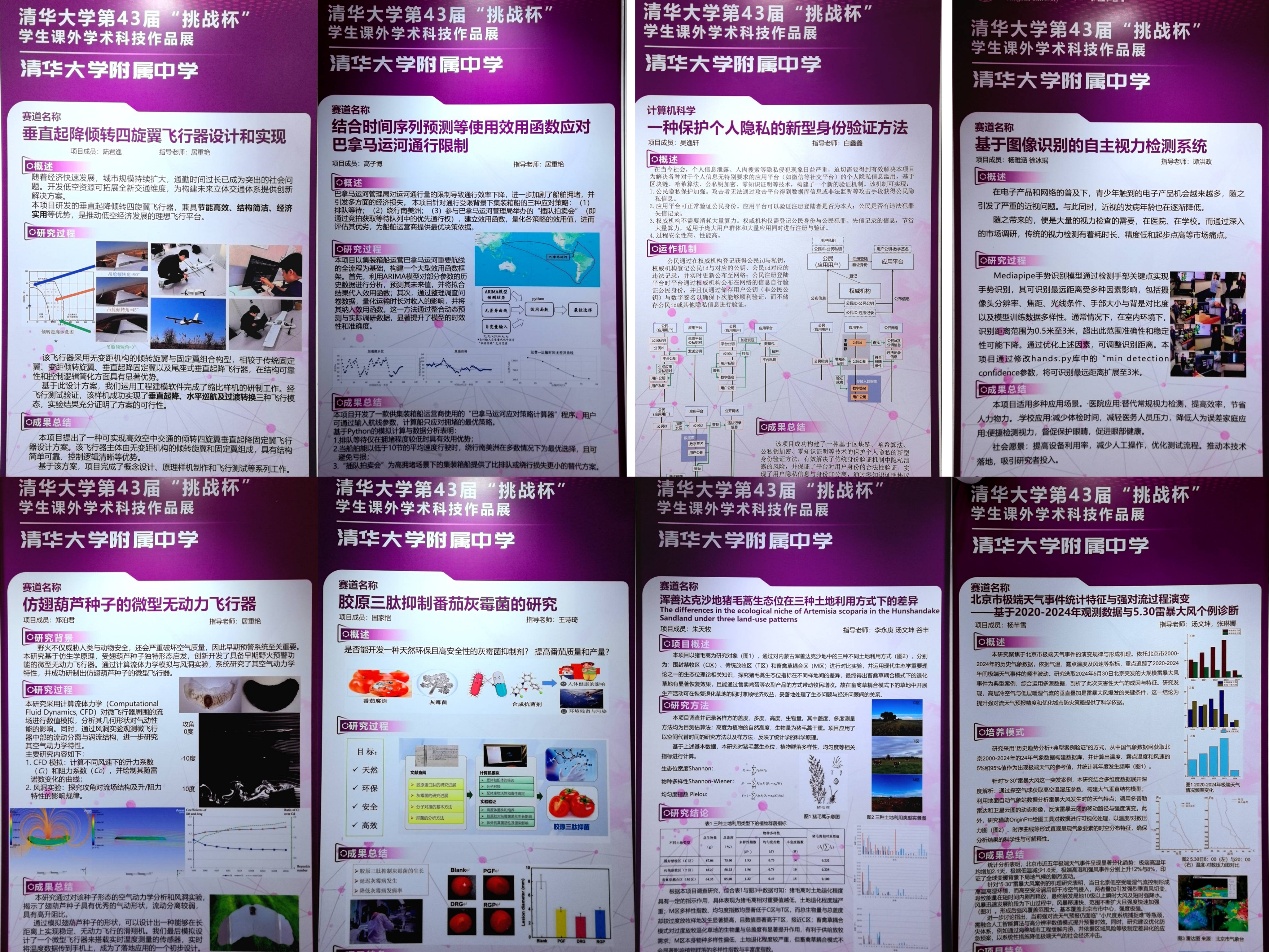 高研实验室及创客空间通过海报的形式展示了《垂直起降倾转四旋翼飞行器设计和实现》《结合时间序列预测等使用效用函数应对巴拿马运河通行限制》《一种保护个人隐私的新型身份验证方法》《基于图像识别的自主视力检测系统》《仿翅葫芦种子的微型无动力飞行器》《胶原三肽抑制番茄灰霉菌的研究》《北京市极端天气事件统计特征与强对流过程演变——基于2020-2024年观测数据与5.30雷暴大风个例诊断》《浑善达克沙地猪毛蒿生态位在三种土地利用方式下的差异》共八个科研项目的研究成果。