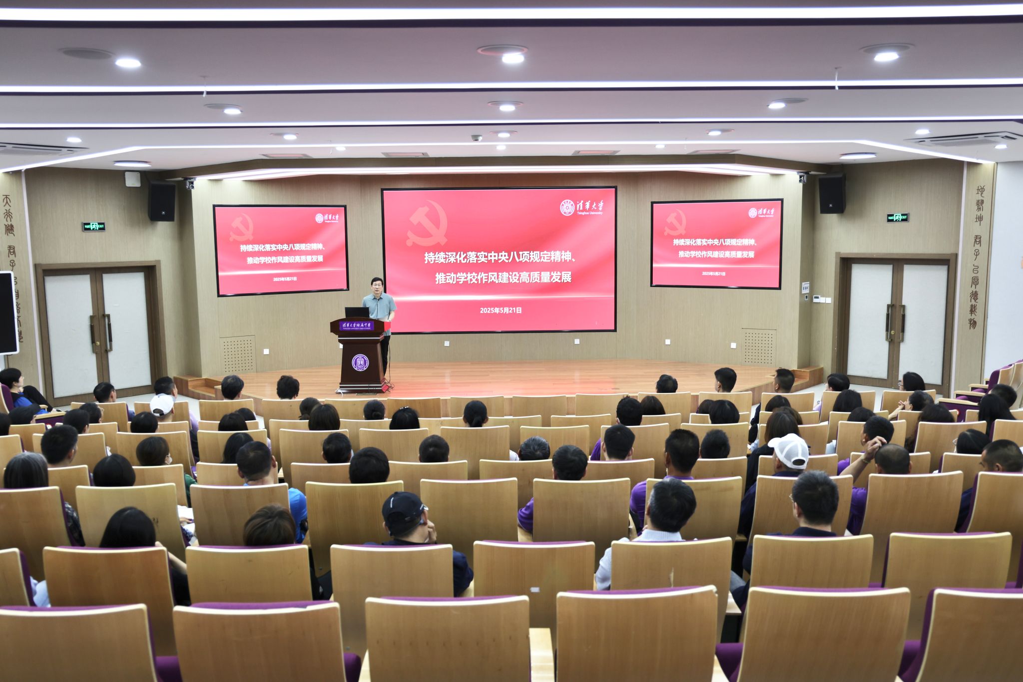 全体人员首先共同观看了大学纪检监察机构制作的警示教育片,发生在大学某单位的职务犯罪典型案例为大家敲响了廉洁从业的警钟。随后,党委副书记、纪委书记魏磊作题为《持续深化落实中央八项规定精神,推动学校作风建设高质量发展》专题报告,带领大家深入学习了总书记关于作风建设的重要论述,阐述了作风建设的重要性与长期性,剖析了违反中央八项规定精神的典型案例,要求各部门要坚持问题导向,不断推动完善制度建设,扎紧制度的笼子。结合附中实际,他进一步强调,作风问题关系附中事业发展全局,要将作风建设深度融入中心工作,全体人员要提高政治站位,增强抓作风改作风的政治自觉,强化纪律法律意识,以优良党风推动校风、教风、学风建设。