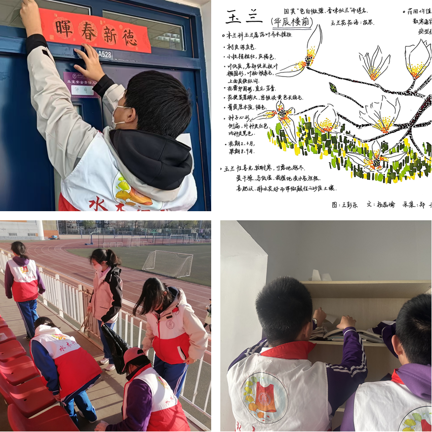 高2308班揭旧春联、高2303班制作校园赏花图、水木行动班级打扫操场看台、高2412班整理公共教室