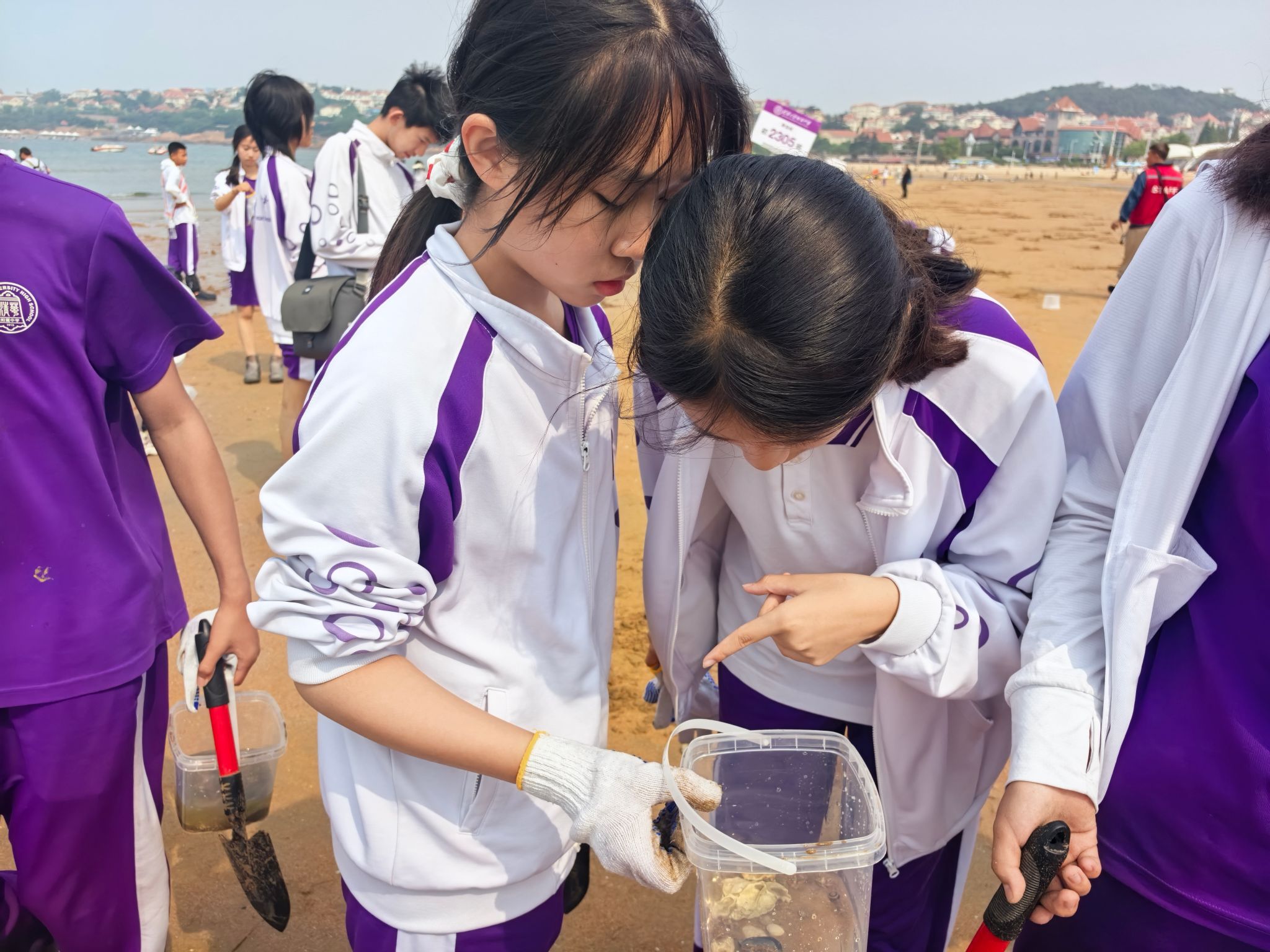 6月8日,同学们的青岛研学之旅迎来科学与人文交融的精彩一日。从晨曦中的潮间带探索,到海军历史的沉浸体验,再到微观粒子的神奇观测,最终以星光下的青春乐章作结,同学们在多元场景中拓展认知边界。清晨,同学们奔赴青岛第一海水浴场,在专业教师指导下开展潮间带生物科考。手持铁锹、蹲身滩涂,大家细致挖掘沙蟹、蛤蜊等生物,观察其形态特征与栖息环境。浪涌声中,同学们不仅收获了满桶“战利品”,更建立起对海洋生态保护的直观认知。